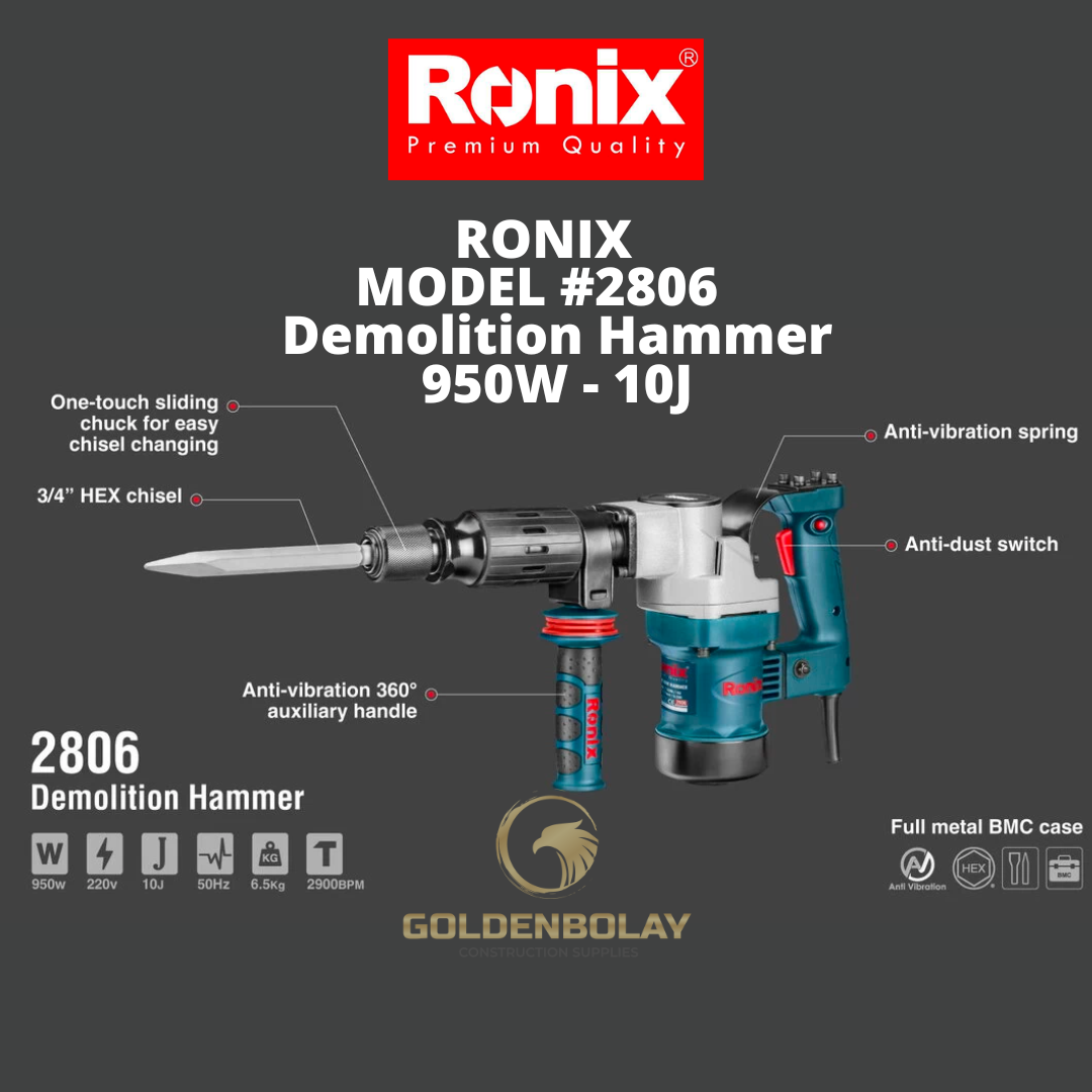 Switch As a demolition hammer which is used for one purpose in every worksite, the Ronix 2806 is equipped with high-quality switches. Around an operator at a construction site who is holding a Ronix 2806, there would be a lot of dust and the only solution to guarantee durable performance of this tool is the anti-dust switch which comes with a switch-lock key for constant and long works.