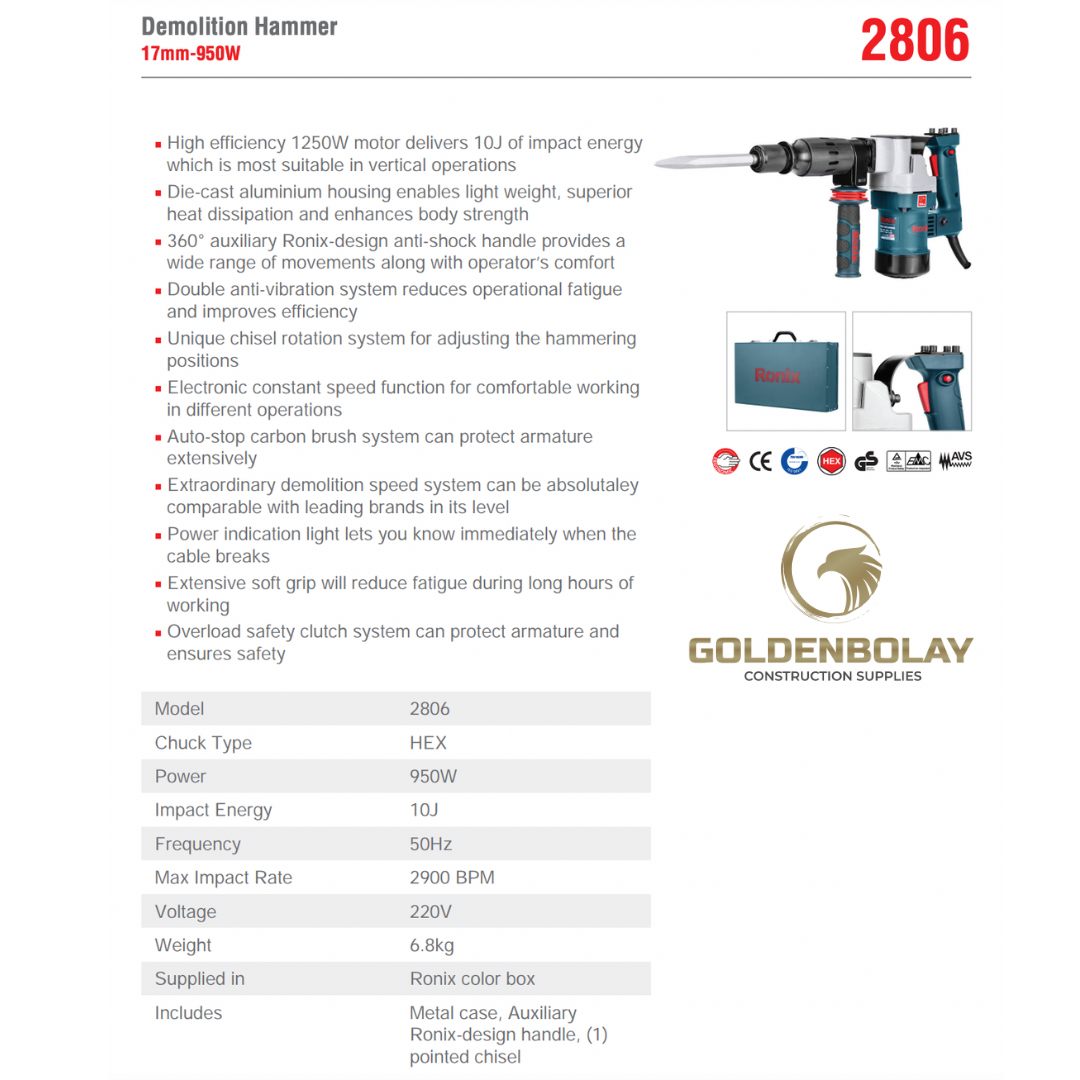 Motor Inside the Ronix 2806 demolition hammer, there is a 950W motor that every part of it is industrially produced with automatic machinery, including the rotor and stator. One of the advantages of this power tool alongside the weight and all of its major features is that it is specifically designed for medium and especially light demolishing needs. And also, when the motor becomes overloaded with a lot of work, the safety clutch system ensures the operator’s and the armature’s protection.