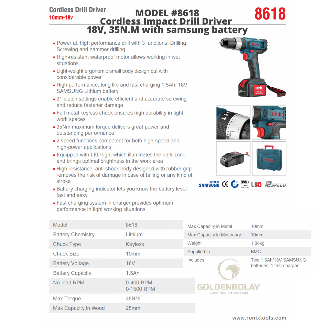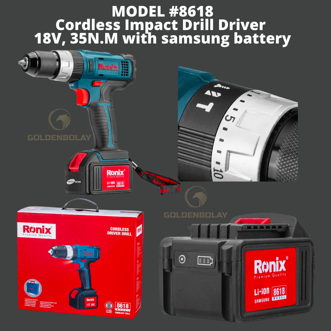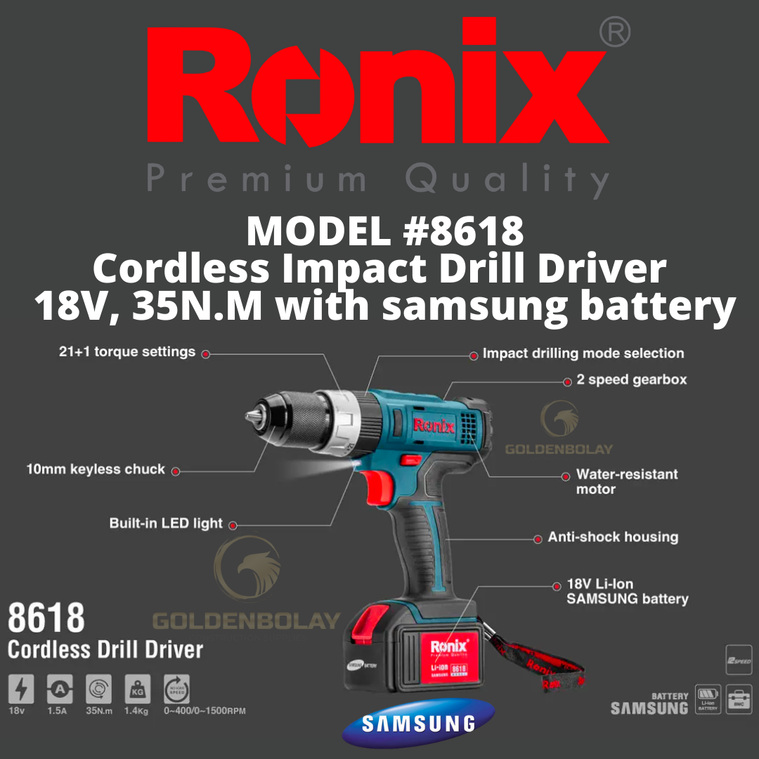 Ronix Cordless Impact Drill Driver, 18V, 35N.M with SAMSUNG BATTERY Model #8618